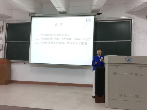 讲座中,甘教授回顾了中国旅游业近几年发展的现状和未来总体发展趋势,引出全域旅游的概念,介绍了全域旅游视角下“资源、市场、产业”的重新定位和思考以及设施、服务和人才的配套。甘教授强调未来的全域旅游应该是“大旅游+大市场+大产业”的格局,旅游人必须要转换思维,对旅游行业重新定位和认识。