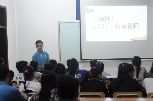 活动开始,王奕翔老师给学生们介绍了孔子的生平,以及孔子在中国的影响力。他巧用一组数字“2569、3000、72”分别介绍道,“今年是孔子诞辰2569年,他有3000多名学生,其中贤者72人”。接着王奕翔老师给学生们讲解了孔子的主要思想“仁”和“礼”,他告诉学生们“仁”就是要时常怀着一颗仁爱的心来对待别人,并用中柬两国礼仪作对比来讲解“礼”。随后王老师带领学生们学习了作揖礼和抱拳礼,并与学生们积极互动,互相行礼以感受中国传统礼仪文化。王奕翔老师还向学生们讲解了孔子的名言“三人行,必有我师焉”、“有朋自远方来,不亦乐乎”,并希望在座的学生们都要互相学习,努力提高自己的汉语水平。