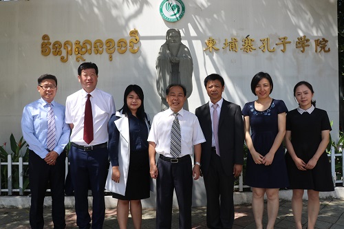 会谈后,九江市代表团在柴克清院长和苏碧娜院长的陪同下参观了孔子学院芳华大楼,柴克清院长和苏碧娜院长向代表团介绍了孔子学院教室、电子图书馆、会议室等设施以及孔子学院开展的一系列文化活动。期间,潘熙宁部长与孔子学院工作的汉语志愿者教师亲切交流,了解了汉语教师志愿者们的大致情况,并进入教室与在孔子学院学习的柬埔寨学生进行交流,鼓励其来中国学习,该学生对潘熙宁部长的鼓励表示十分感谢。