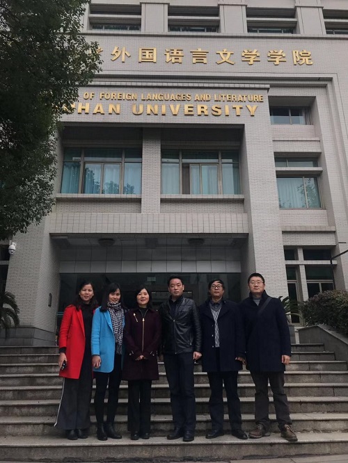 为了引进高层次人才,加速推进翻译专业建设、教学实习实训、实验室建设、校区资源整合等工作,12月4日,外国语学院副院长罗其娟、贺林茂教授、英语教育教研室副主任熊淑英、办公室主任邓海波一行四人到武汉大学外国语言文学学院调研考察。