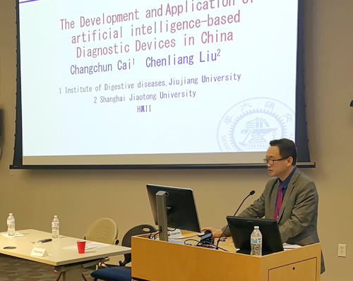 蔡长春主任在演讲中介绍了九江学院消化病研究所与上海交通大学共同研制的系列人工智能医学检测设备,系统地阐述了该设备在当今中国互联网医疗应用中的地位和作用以及AI系列产品的开发和应用现状;他分析了医疗数据的采集、共享、智能分析以及数据的云平台应用在互联网和医疗之间至关重要的作用,并现场演示了全球第一款随身携带即时诊断产品(Heart Watchdog)的数据采集和AI诊断功能,引发各国与会专家的强烈兴趣,他们纷纷感叹中国的科技发展并提出合作意愿。