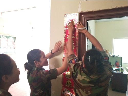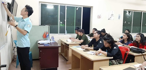 当晚,金边警备旅孔子课堂教室充满了柬埔寨士兵的欢声笑语,士兵学生们每天都有繁忙的工作和训练,但仍然坚持学习汉语,十分踊跃地参与到此次春节文化体验活动中来,活动场面热闹非凡。活动由警备旅中方负责人魏来老师宣布开始,第一项内容是介绍春节传统文化习俗。魏老师指着白板上提前写好的新年祝福语,一边带领大家读、写,一边解释意思,各位同学听得十分投入,积极和老师互动,并认真地记下了笔记。