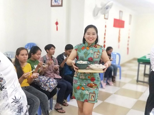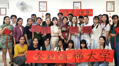 春节是我国最隆重也是最富有特色的传统文化节日,值此佳节,金边高棉大学举办了“金猪迎春来,中柬共团圆 ”的主题文化活动庆祝春节。2019年1月24日,金边高棉大学负责人苏昆(SOKHOEUN)、教务负责人万纳(Vanna)、教师冯娜美(CHANTREA)、柬埔寨皇家科学院孔子学院金边高棉大学负责人刘建玲、公派教师张也、汉语教师志愿者王芳芳、马俊秀、刘青清、杨馥聪、吴立愉以及金边高棉大学的部分周末班学员齐聚一堂,欢庆新春,共同度过了一个别具意义的中国春节。