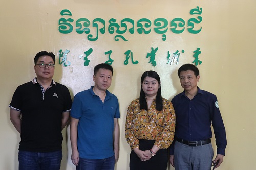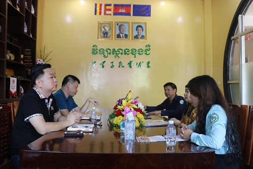 4月3日,新中旺投资管理有限公司业务发展经理杜宇鸣二人访问了柬埔寨皇家科学院孔子学院,柬埔寨皇家科学院孔子学院中方院长柴克清、柬方院长苏碧娜(Vuth Sopheakna)在孔子学院一楼会议室接待来宾,双方展开友好会谈。