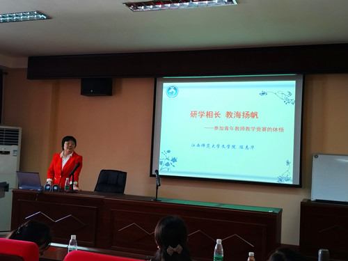 活动中,陈志华老师首先以此次代表江西省参加国青教赛的授课节段“形象研究”为例,进行了20分钟的教学展示。教学中,陈老师围绕授课内容引经据典,旁征博引,环环相扣地将知识点一一阐述,整个教学过程结构清晰,目标明确,语言简洁、细腻,从教学设计到教学实施各个环节无不体现陈老师极高的专业素养和敬业精神。