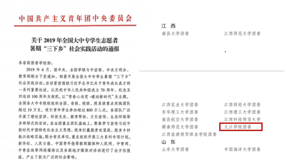 此外,由团中央青年发展部、中国青年报社、人民网联合开展的2019年大中专学生“三下乡”暑期社会实践“千校千项”成果遴选活动中,经管学院留守儿童关爱服务团、化环学院“美丽中国,我们在行动”暑期三下乡服务队获得优秀团队案例,火东璇、陶斌斌两名同学获得优秀实践者称号。由中国环境科学学会主办的全国“大学生在行动”环保科普行动中,九江学院荣获全国“最佳组织单位”,九江学院“大学生在行动”环保科普服务队获得“十佳示范小分队”称号,化环学院王颖老师被评为“优秀指导教师”,火东璇被评为“十佳志愿者”。