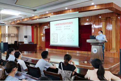 针对医疗辅助和后勤人员,急诊科主任但传军详细讲解了胸痛中心的基本概念和建设要求,结合心肺复苏的基本要领,从如何判断意识情况、如何呼叫救援电话、如何进行CAB等进行培训。由于参与人数多,疫情期间不宜让大家聚集进行实操,医务科副科长何佰顺表示,会后医务科将组织专家到各科室再次进行培训授课,补充实操训练。