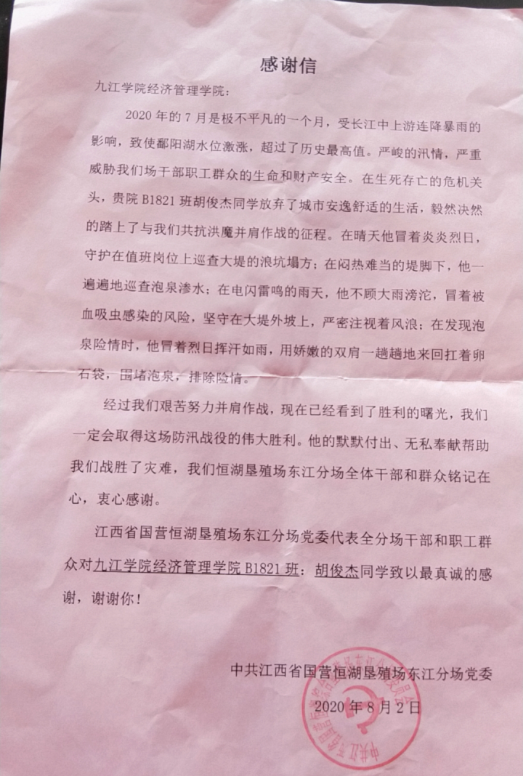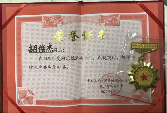 抗洪形势好转后,中共江西省国营恒湖垦殖场东江分场党委给胡俊杰颁发了防汛抗洪应急标兵的荣誉证书,并给他所在的学院写了一封表扬信,表扬他为抗洪防汛付出的努力。信中写道“在生死存亡的危急关头,贵院B1821班胡俊杰同学放弃了城市安逸的生活,毅然决然的踏上了与我们和洪魔并肩作战的征程。在晴天他冒着炎炎烈日,守护在值班岗位上巡查大堤的浪坑塌方;在闷热难当的堤脚下,他一遍遍地巡查泡泉渗水......他的默默付出、无私奉献帮助我们战胜了灾难,我们恒湖垦殖场东江分场全体干部和群众铭记在心,衷心感谢。”