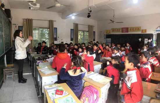 江欣鸿正在给三(2)班学生上音乐课