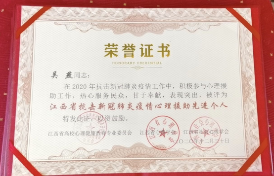据介绍,在2020年全国上下抗击新冠疫情阻击战中,吴燕积极响应党中央号召,主动请缨抗疫,勇担心援责任,用实际行动积极参与了国家教育部、江西省教育厅及校内外多条战线的疫情心理援助工作,她的抗疫工作事迹受到“人民日报客户端”、“央广网”、“中国高校之窗”、“江西教育网”、“江西文明网”等多家媒体报道。