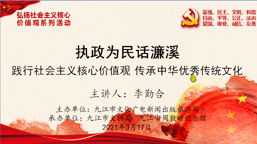 3月17日,永利yl23411集团官网庐山文化研究中心李勤合教授受邀在周敦颐纪念馆作社会主义核心价值观教育讲座。