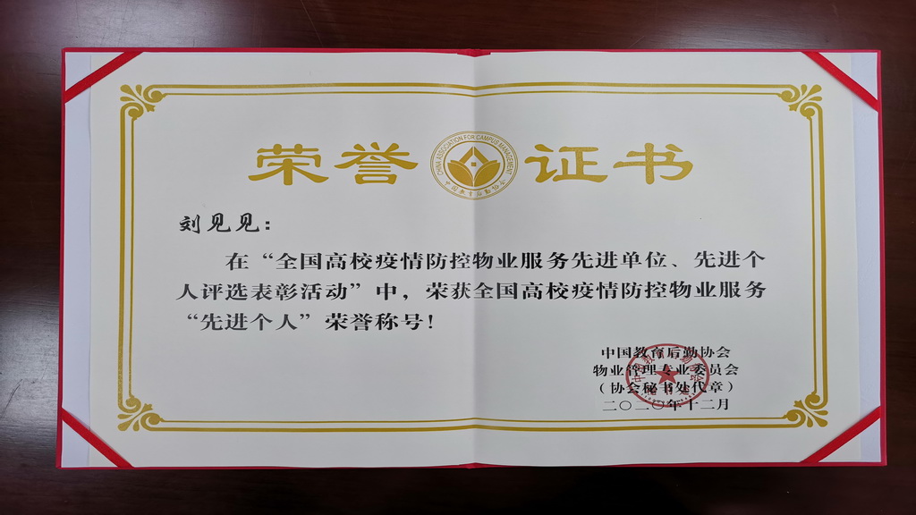 3月28日,中国教育后勤协会物业管理专业委员会2020年会在昆明召开,会上表彰了中国教育后勤全国高校疫情防控物业服务先进单位、先进个人。永利yl23411集团官网后勤管理处接待中心主任刘见见获得江西省高校唯一一名“全国高校疫情防控物业服务先进个人”荣誉称号,为学校争得了荣誉。