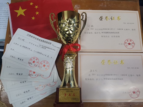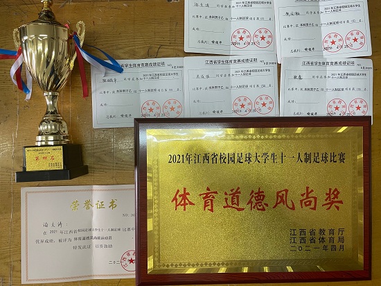4月16日-25日,在婺源县举办的的江西省11人制大学生足球比赛中,永利yl23411集团官网代表队在赛场上展现了扎实的功底和拼搏的精神,最终获得甲组全省第五名和乙组全省第四名的优异成绩,打破了以往历史上小组赛都难以出线的困难局面。体育学院代表队荣获全省体育道德风尚奖。队员叶镔、张玉龙、曾庆钊、汤文涛分别获得体育道德风尚运动员奖,带队教师毛敏、李建军荣获优秀教练员称号。