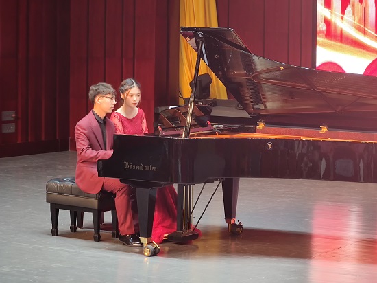 音乐会在钢琴曲《山丹丹开花红艳艳》的演奏中拉开了帷幕,此曲将中国特有的红色美学元素与西方钢琴演奏技法完美地融合,诉说了中央红军到达陕北的革命历史史实,展现了陕北地区人民的爱国情怀和在中国共产党领导下的美好生活画面。
