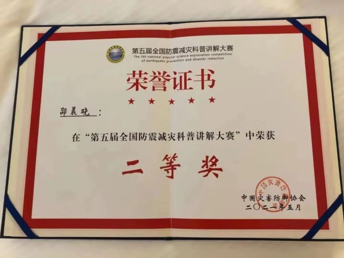 5月12日,正值汶川地震13周年纪念日,第五届全国防震减灾科普讲解大赛总决赛在四川绵阳举行。永利yl23411集团官网文学与传媒学院播音与主持艺术专业A1852班邵晨晓同学经九江市应急管理局、江西省地震局选送,作为江西省的唯一代表,也是唯一的在校大学生选手,与来自全国各地防震减灾科普一线的其他31名选手同台竞技。邵晨晓同学荣获了全国第六名(二等奖)的优异成绩,此名次为该赛事有史以来江西省取得的最好成绩。