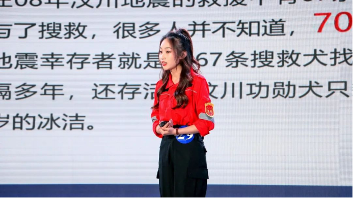 在自主命题的环节中,邵晨晓同学以《搜救犬——致敬无言的英雄》为题,围绕汶川大地震中的搜救犬进行讲解,展现了灾难面前动物们的使命与担当,选题新颖,文脉通畅,感情真挚,台风稳健,获得了评委与观众们的认可。