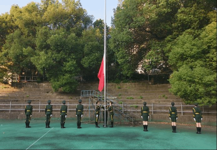 上午7时,升旗仪式正式开始。朝阳下闪耀着几抹动人的色彩:国旗红、国防绿、天使白。英姿飒爽的校团委国旗班,迈着铿锵有力的步伐,护送着国旗至升旗台。伴随着雄壮的《中华人民共和国国歌》,鲜艳的五星红旗迎着旭日冉冉升起,身着国防绿和天使白的学生方阵庄严肃立,向国旗行注目礼,伴着国歌齐声高唱,表达对祖国的热爱和崇敬,对和平的向往与坚守。