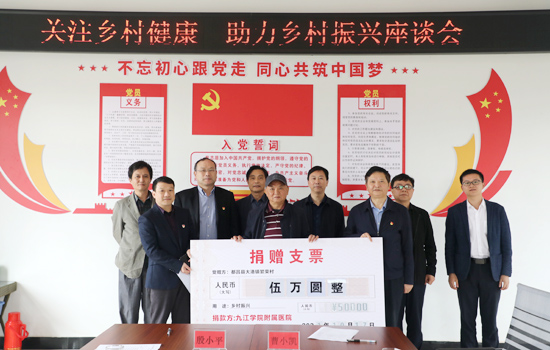 在繁荣村村委会议室,与会人员就秀美乡村打造、特色产业振兴、红色旅游发展等工作进行了深入交流探讨。九江学院附属医院现场向繁荣村捐赠了五万元帮扶资金,并签订了健康帮扶额外报销协议书,今后,大港镇辖区内所有已脱贫户、三类人员及我院定点帮扶村患者在我院就医住院,可再次办理住院治疗费个人支付金额中医保允许报销范围内额外20%的费用减免,附属医院定点帮扶的已脱贫户患者更可享受额外50%的费用减免。