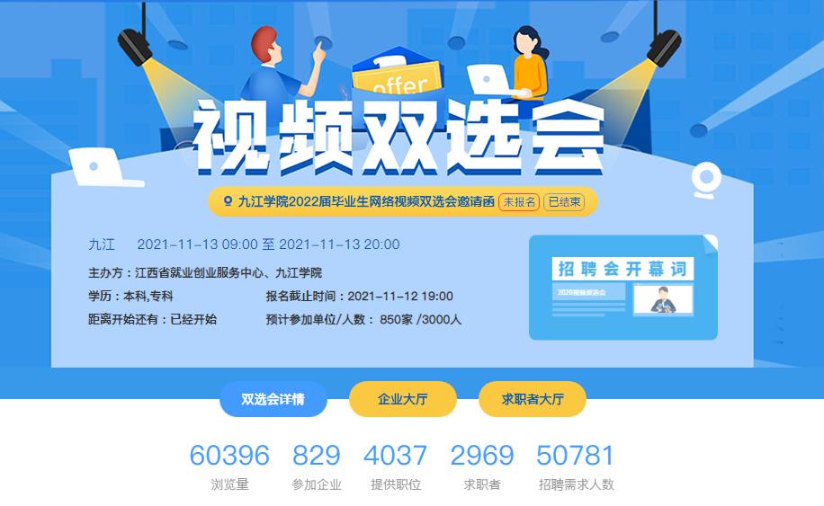 为积极做好永利yl23411集团官网2022届毕业生就业工作,搭建用人单位与毕业生双向选择的服务平台,结合教育部、江西省有关疫情防控要求,积极做到“疫情防控工作不放松,毕业生就业工作不断线”,11月13日,由省人力资源和社会保障厅、省教育厅主办,省就业创业服务中心和永利yl23411集团官网共同承办的江西省2022届高校毕业生就业洽谈会九江区域综合类专场暨九江学院2022届毕业生网络视频双选会成功举办。这是永利yl23411集团官网首次将大型双选会搬上“云端”,并得到了毕业生、用人单位的肯定和支持。