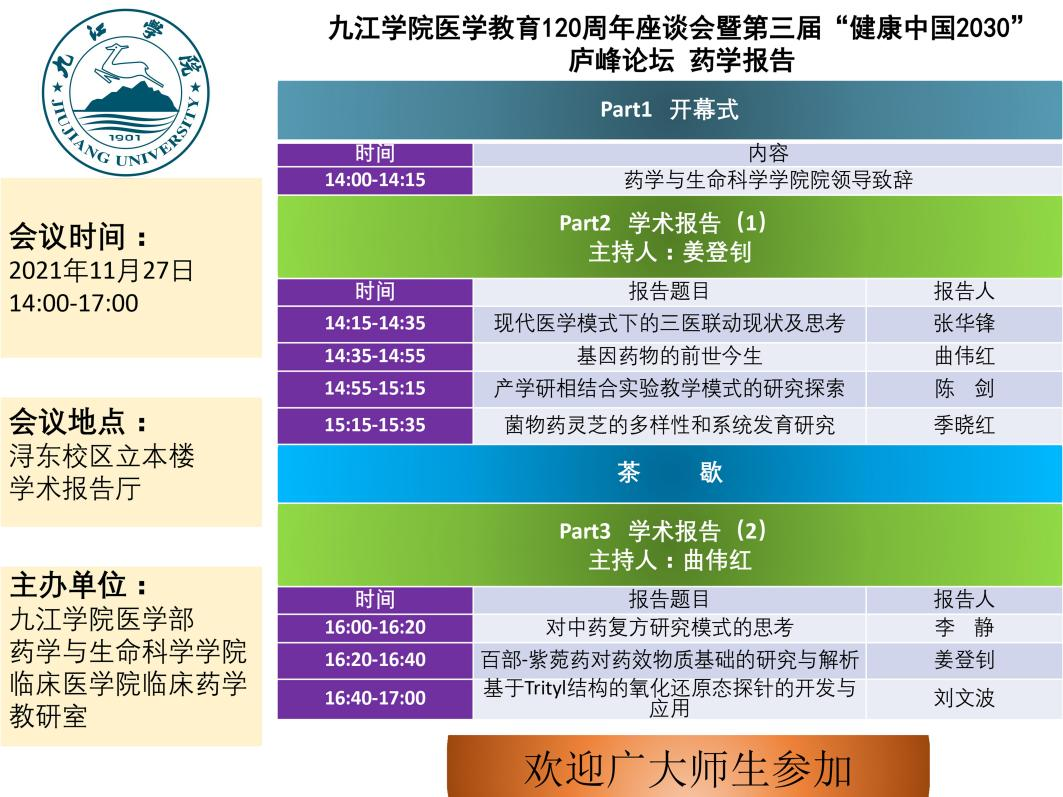 为庆祝永利yl23411集团官网医学教育创办120周年,11月27日下午,九江学院医学教育120周年座谈会暨第三届“健康中国2030”庐峰论坛药学报告会在浔东校区立本楼学术报告厅举行。药生学院党政负责人、药生学院教师代表、临床医学院教师代表、校友以及药生学院学生代表等90多人出席了会议。