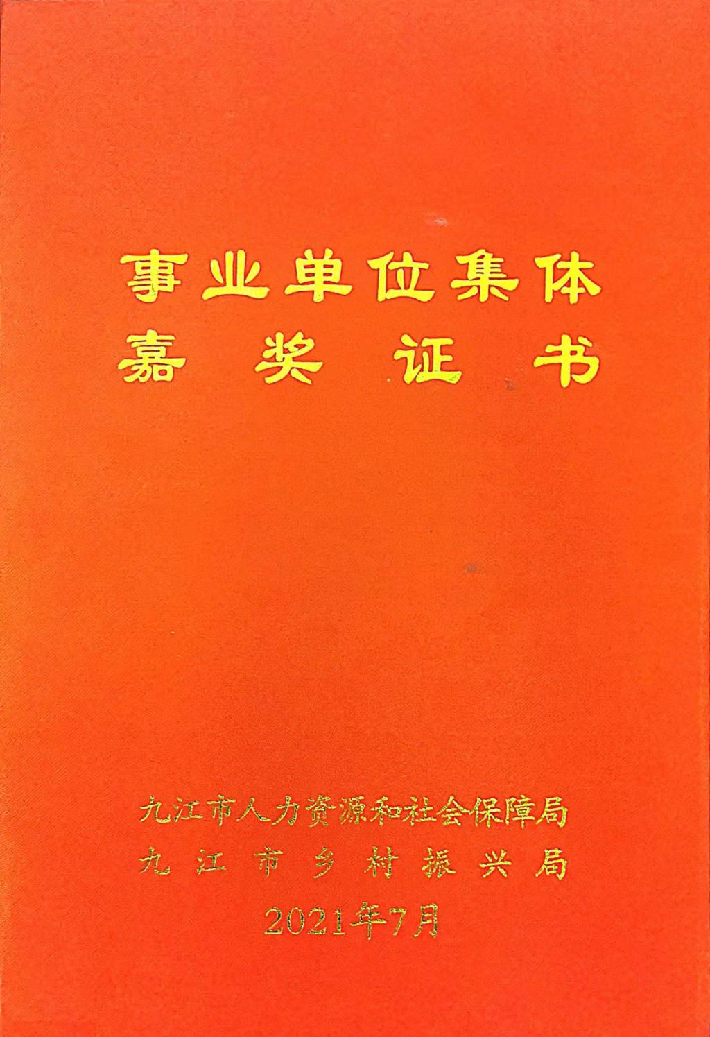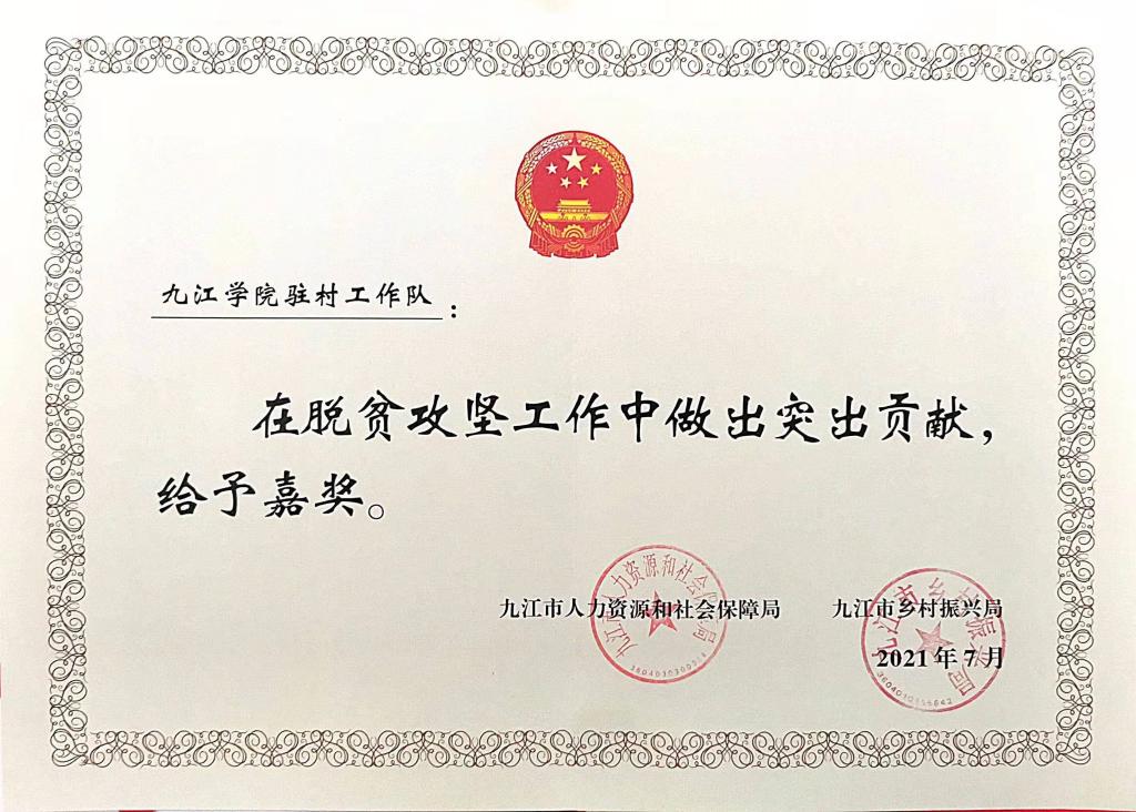 近日,从九江市人力资源和社会保障局、九江市乡村振兴局《关于给予九江市高级技工学校等3个集体、汤高峰等36名同志记功和九江市房地产公司等36个集体、吴寰等170名同志嘉奖奖励的决定》文件获悉,永利yl23411集团官网脱贫攻坚驻村工作队荣获市事业单位脱贫攻坚专项奖励集体嘉奖。