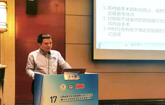 大会进行了耳鼻咽喉头颈外科学第一届手术视频比赛,九江学院附属医院韦永豪副主任通过“耳内镜下后鼓室胆脂瘤清除+人工听骨植入术”视频完整且清晰地演示了整个耳内镜手术的过程,尤其讲述水下磨骨的部分十分精彩,他在手术中回答了专家们对于耳内镜手术是否能完整清除病变的疑问,得到了省内外耳科专家及同仁们的充分认可。经过激烈角逐,韦永豪副主任荣获耳科组视频比赛二等奖,充分展示了附属医院青年医师的风采和耳内镜手术水平。