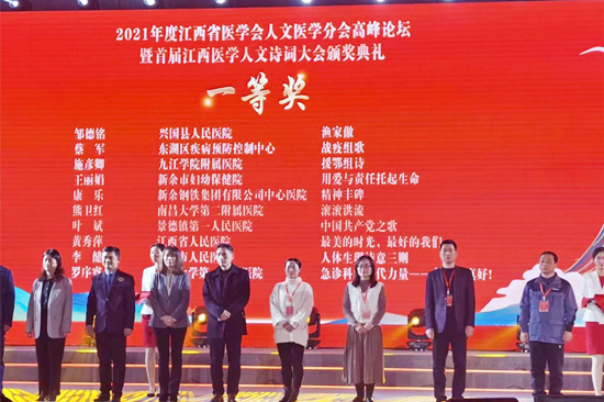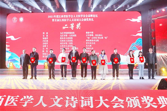为深入推进党史学习教育,弘扬“红医精神”,进一步提升我省医务人员的医学人文素养,1月8日,由江西省医学会主办,江西省医学会人文医学分会和南昌大学第二附属医院承办的2021年度江西省医学会人文医学分会高峰论坛暨江西医学人文诗词大会颁奖典礼在英雄城南昌隆重举行,九江学院附属医院作为江西省人文医学分会主委单位受邀参加各项议程。九江学院附属医院负责人带队参会,消化内科施彦卿医师、肾内科周静医师分别荣获首届江西医学人文诗词大会一等奖和二等奖。