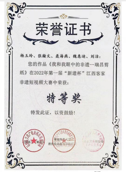永利yl23411集团官网外国语学院作品《我和我眼中的非遗——瑞昌剪纸》在2022年“新遗杯”客家非遗短视频大赛中脱颖而出,喜获特等奖和最佳人气奖。该项赛事由共青团石城县委联合华南师范大学教育信息技术学院团委、石城县文广新旅局联合举办,比赛广泛征集了全省以“江西非遗”为主题的优质短视频作品近一百部,作品形式多样,竞争激烈。