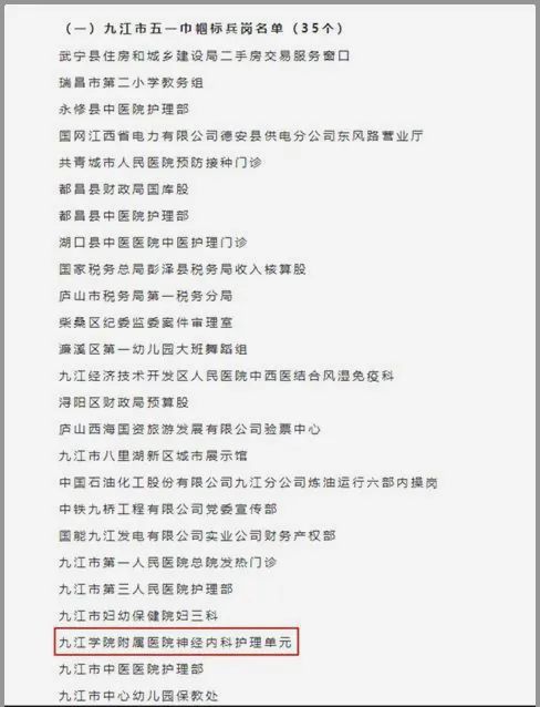 九江学院附属医院神经内科护理单元荣获“九江市五一巾帼标兵岗”荣誉称号