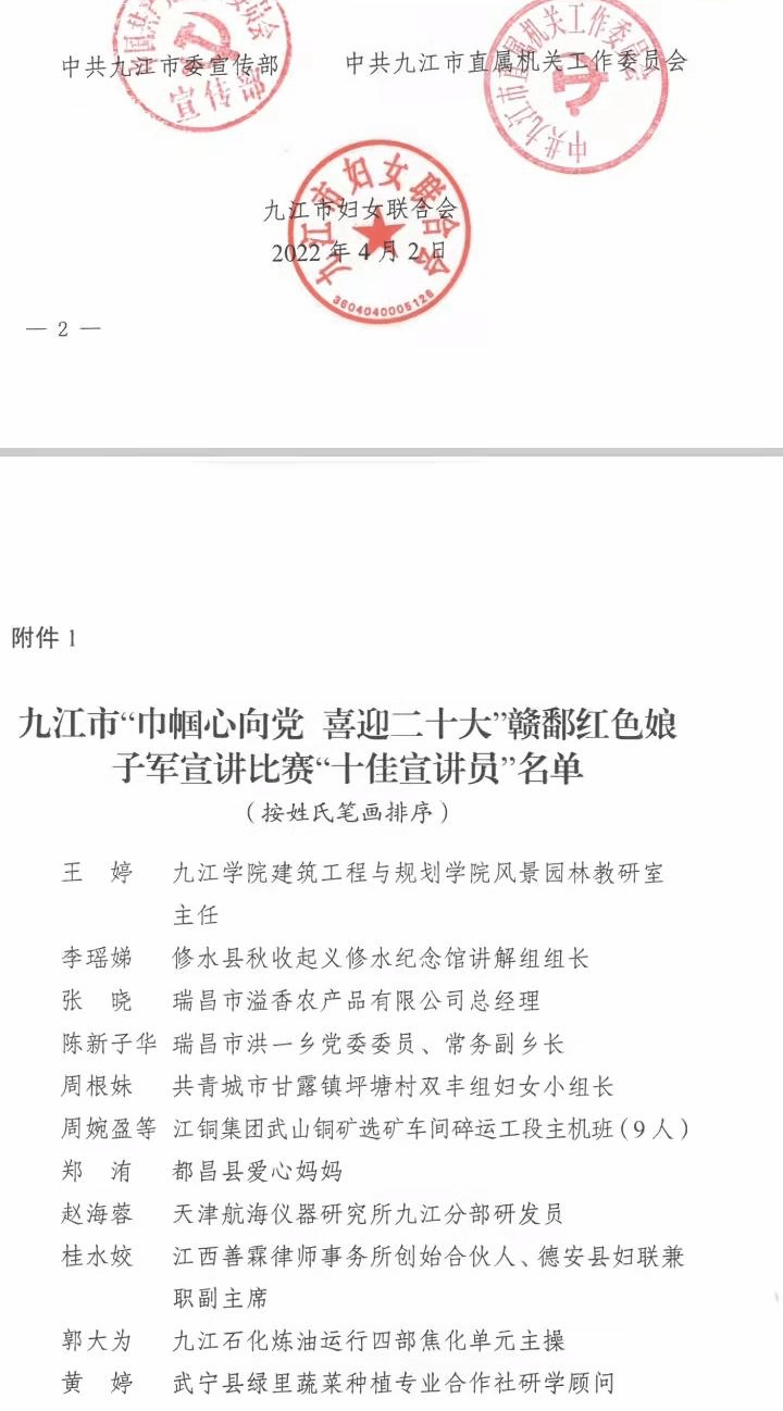日前,九江市委宣传部、市直机关工委、市妇联在全市各界妇女群众中开展了九江市“巾帼心向党、喜迎二十大”赣鄱红色娘子军宣讲比赛。经过集中比稿、参赛选手现场宣讲等比赛环节,由永利yl23411集团官网校工会推荐参赛的建筑工程与规划学院教师王婷最终被评为“十佳宣讲员”。