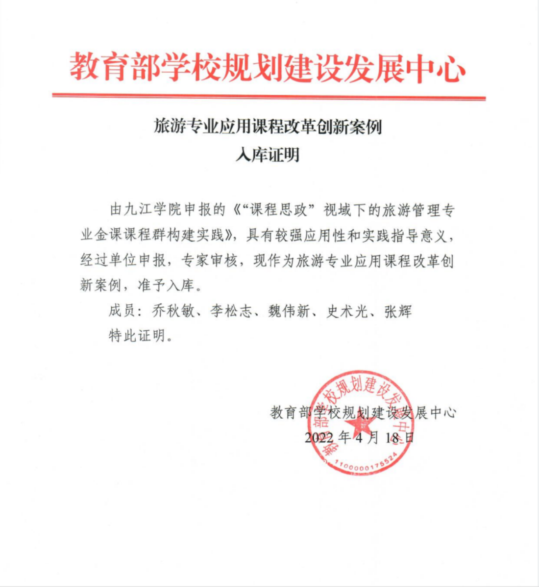 近日,教育部学校规划建设发展中心公布旅游专业应用课程改革创新案例入库名单,由永利yl23411集团官网旅游与地理学院教师乔秋敏、李松志、魏伟新、史术光、张辉等申报的《“课程思政”视域下的旅游管理专业金课课程群构建实践》案例脱颖而出,作为课程改革创新优秀案例入选教育部学校规划建设发展中心课程改革创新案例库。