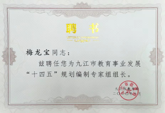 自2020年11月九江市教育局正式委托永利yl23411集团官网编制《规划》以来,梅龙宝教授带领团队成员黄为俊、伍亚魁、章新成、张亚珍、蒋枫霆、张立龙、朱青、张富生、冉丛林等,在市教育局直接领导下,经过实地调研、问卷调查、网上征集、座谈交流和专家评审,历时一年半,编制形成《规划》,经九江市人民政府第三次常务会议审议通过,于2022年4月21日正式发布,标志着梅龙宝教授团队圆满高质量完成了《规划》编制任务,为永利yl23411集团官网深化校地合作,发挥高端智库作用,服务地方经济社会发展,贡献了九江学院力量。