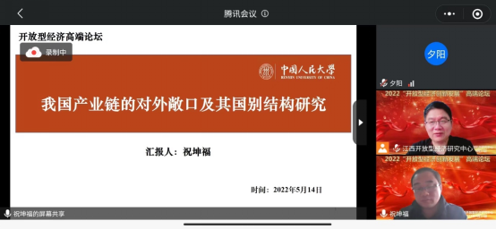 为加快推进江西内陆开放型经济试验区建设,深入推进更高水平开放,着力打造内陆双向开放新高地,探索促进贸易和投资自由化便利化、降低综合物流成本、承接境内外产业集群转移、支持老区与大湾区产业合作、推进科技创新体制机制改革、加强对外文化交流合作,5月14日,经济学院和江西开放型经济研究中心联合举办了“开放型经济创新发展”高端论坛。论坛以“腾讯会议+视频直播”的方式进行。