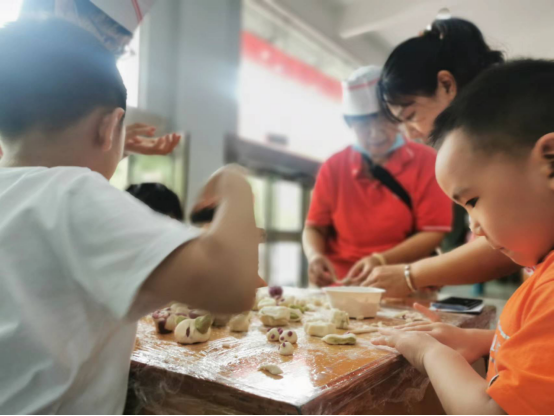 活动广泛邀请了社区的老年人、孩子们和九江学院关工委“五老”(老干部、老战士、老专家、老教师、老模范)代表共同参与。在活动现场,很多是祖辈带着孙辈前来参加活动,年龄最小的3岁多点,年龄最长者则有75岁。活动中,长者态度认真地投入其中、一边教一边做,时不时地关注一下“小手”;幼者则有样学样,将面团在小手中拿捏,时不时地将其在桌案上搓压,开心的笑容挂满了小脸。