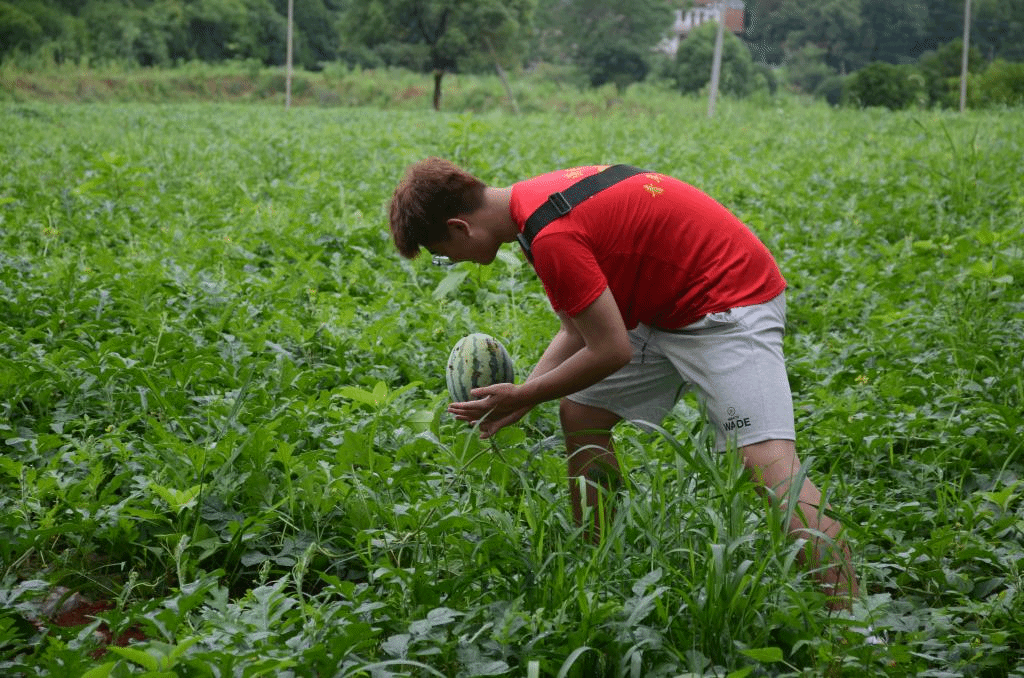 随后,社会实践团队跟随村干部的脚步前往多个乡村振兴项目学习调研。第一站来到了前山村的西瓜地,甘露镇前山村,它曾经是共青城市远近闻名的西瓜村,现前山村通过“党支部+合作社+农户”模式,将流转的30余亩荒地全部种上了前山西瓜。社会实践团队的所有成员跟着农户学习了种西瓜的要领,并一起下到西瓜地里,修剪多余的枝蔓,以便提升花粉授精传播的成功率,提高西瓜的座果率。