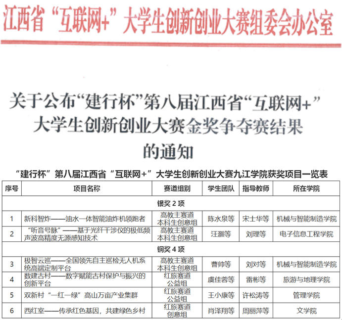 大赛中,永利yl23411集团官网师生们发扬团队精神,努力拼搏,争创佳绩,经过激烈角逐,机械与智能制造学院《新科智炸——油水一体智能油炸机领跑者》和电子信息工程学院《“听音号脉”——基于光纤干涉仪的极低频声波高精度无源感知技术》2个项目获省赛银奖,并经江西省省赛组委会推荐参加第八届中国国际“互联网+”大学生创新创业大赛总决赛;机械与智能制造学院《极智云巡——全国领先自主巡检无人机系统高端定制平台》、旅游与地理学院《数建古村——数字赋能古村保护与振兴的创新平台》、管理学院《双新村“一红一绿”高山万亩产业集群》和文学院《西红室——传承红色基因,共建绿色乡村》4个项目获省赛铜奖。