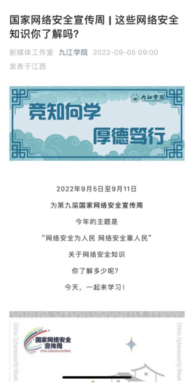 疫情期间,为尽量减少人员聚集,学校充分利用网络平台,调动各二级学院的力量,广泛深入开展网络安全宣传教育活动。学校党委宣传部积极组织师生参加2022江西省网络安全知识竞赛,编印纸质宣传册发放给师生,并通过校园网、官方微信、微博、QQ发送网络安全宣传内容,各二级学院及时进行转发宣传,进一步增强了师生网络安全意识,提升了师生网络安全防护技能。