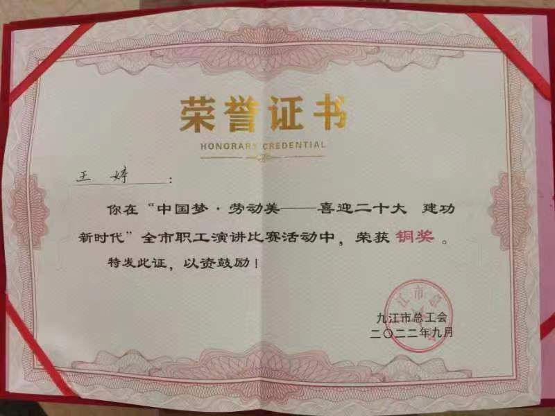 近日,由江西省九江市总工会主办、九江市工人文化宫承办的“中国梦·劳动美——喜迎二十大 建功新时代”全市职工演讲比赛(决赛)举行。永利yl23411集团官网选派的建筑工程与规划学院的王婷老师参加本次比赛,并荣获铜奖。