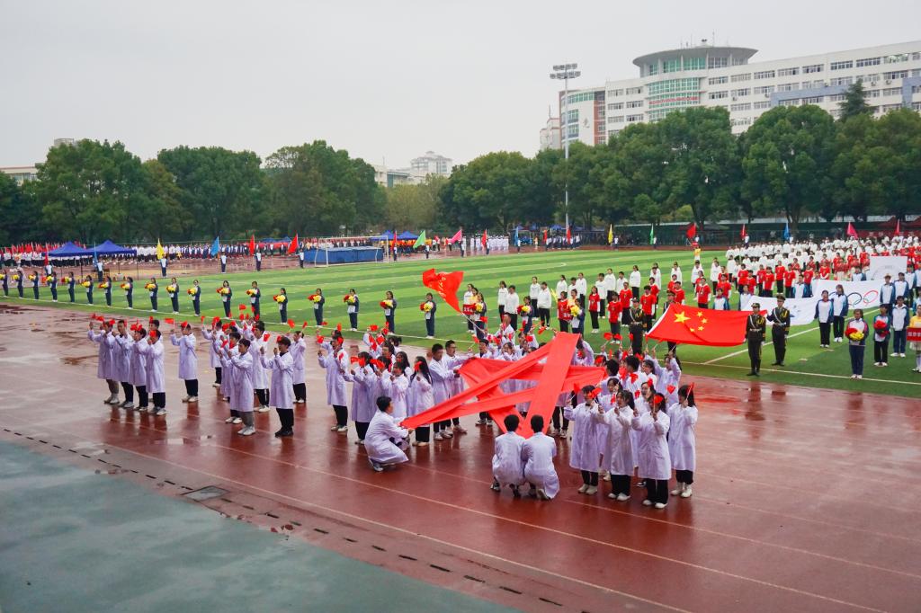 10月27日上午8时整,开幕式在主校区南区田径场隆重举行。 伴随着昂扬振奋的乐曲,22支方阵队踏着矫健的步伐依次入场。击鼓表演、汉服舞蹈、纸牌拼字……各二级学院结合学院和专业特色,用别出心栽的表演向党的二十大献礼。