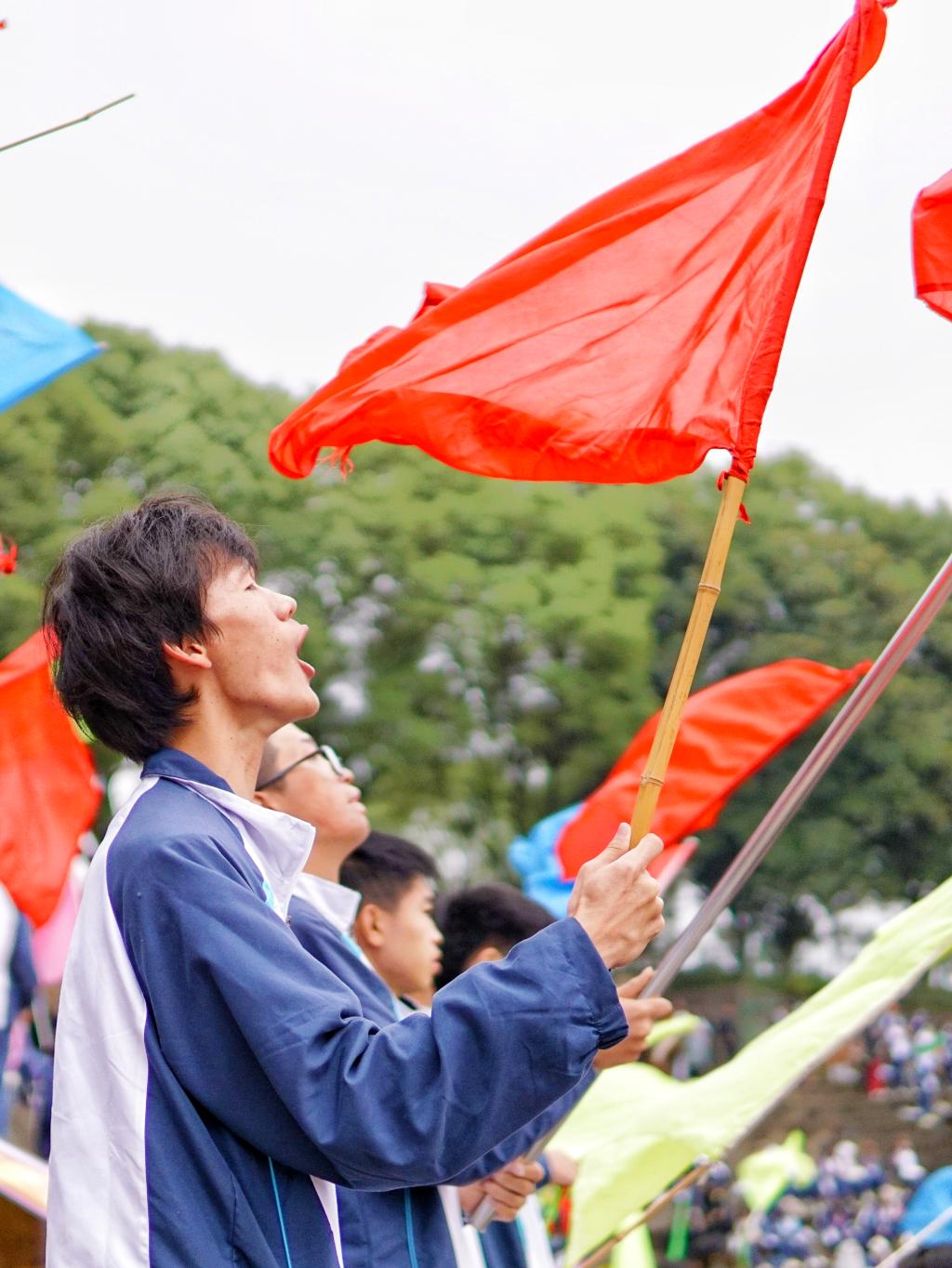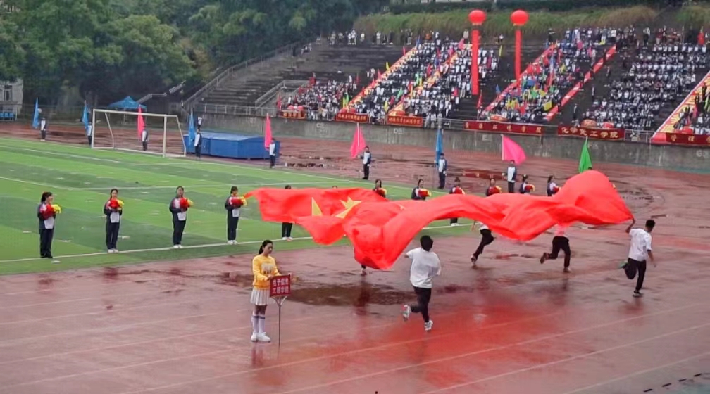 “当五个人拉着国旗飞奔跑过主席台,音乐响起的那一刻,我泪目了!”在观众席,旅游与地理学院A2121班饶文婷激动地说道。