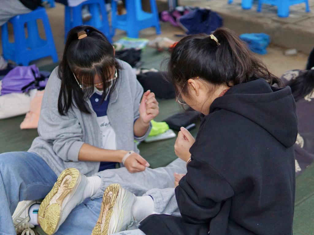 记者注意到,在田径场外搭建有各个学院的大棚,水、药品以及食物应有尽有,时刻都有志愿者值守。“我们要密切关注运动员在赛场上的情况,为他们提供及时的赛前和赛后服务。”值守在化学化工学院大棚的A2121班童欣妮说道。