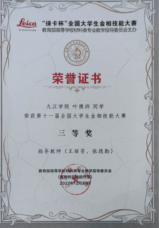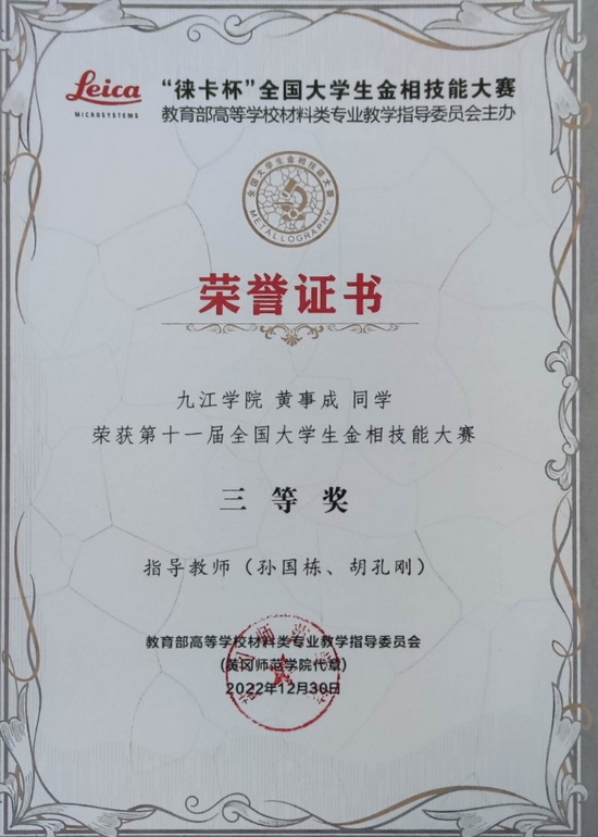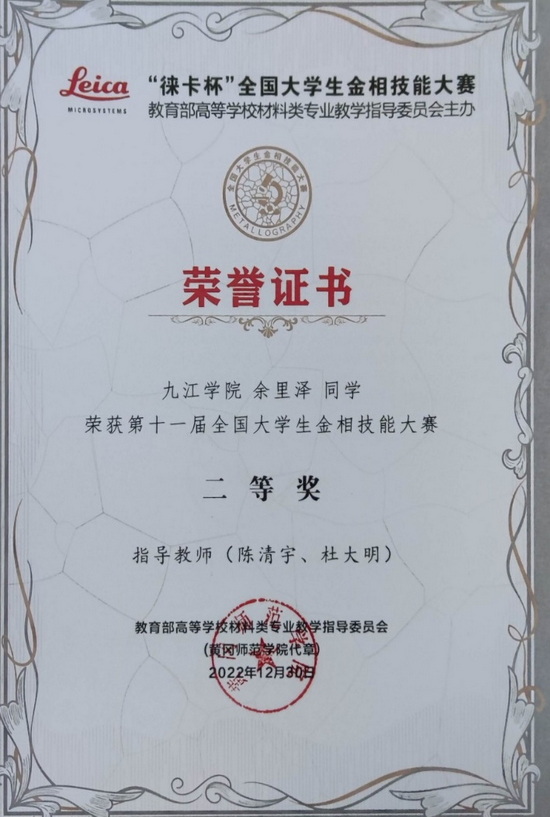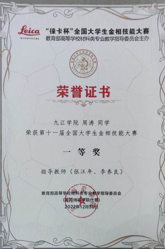 近日,由教育部高等学校材料类专业教学指导委员会主办、黄冈师范学院承办的第十一届全国大学生金相技能大赛落幕,共有来自清华大学、吉林大学、四川大学、武汉大学等414所高校的3700余名在校大学生参加了复赛和决赛阶段的比赛。永利yl23411集团官网材料科学与工程学院周涛同学荣获个人一等奖,余里泽同学荣获个人二等奖,叶德洲、黄事成同学荣获个人三等奖。