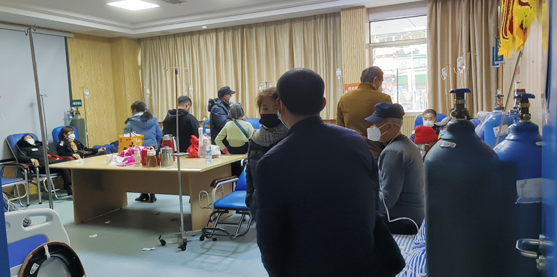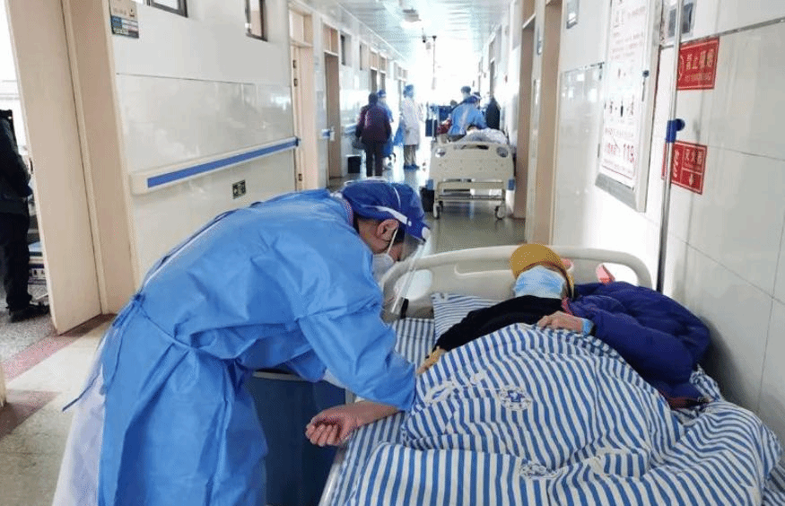 护士来到患者床头,抬头看看监测仪器上的数据,低头看看患者。由于这里住着的大都是七八十岁的高龄患者,护士每隔一会就要查看患者的情况,并帮他们翻身。他们工作起来的模样,很难看出大家都是带病上岗。“这段时间,70岁以上的高龄肺炎患者突增,现在每天都是床位全满。这些老人送到医院已经属于极度缺氧的状态,他们大多都已经是白肺了,没有办法自主呼吸。”医生李检宝一边咳嗽着一边告诉记者,“虽然变异后的新冠病毒毒力在降低,病死率也在减少,但传染性极强;每年冬天又是流感、心脑血管、老年病的高发季节,和新冠并存,这让一些有基础病人老人病情加重,也变得更复杂。”