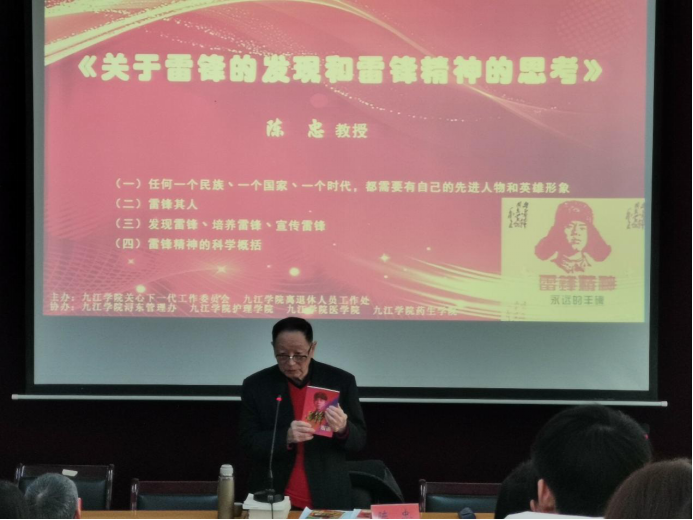 在第60个学雷锋纪念日前夕,永利yl23411集团官网关心下一代工作委员会认真学习宣传贯彻习近平对深入开展学雷锋活动作出的重要指示,开展了“学雷锋月”主题活动。3月3日下午,关工委邀请全国育人楷模、江西省著名德育专家、九江学院关工委“五老成员”陈忠教授,为永利yl23411集团官网学生和辅导员代表做了题为《关于雷锋的发现和雷锋精神的思考》的专题讲座。江西省教育厅关工委健康安全活动负责人周慧铭,九江市关工委报告团副团长钟万祥,原副校长、校关工委执行主任吴桃娥,离退休处、浔东管理办、药生学院、医学院和护理学院相关负责人及师生代表100余人共同参加了本次讲座。本次讲座由校关工委和离退休处主办,学校关工委委员张浦强教授主持。