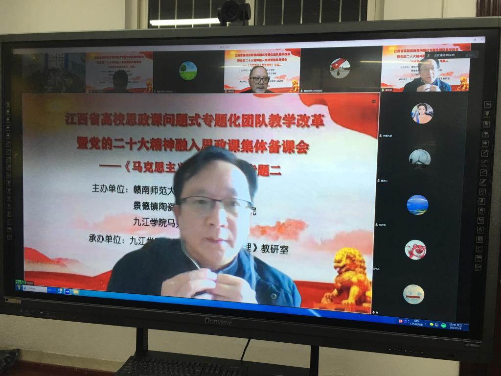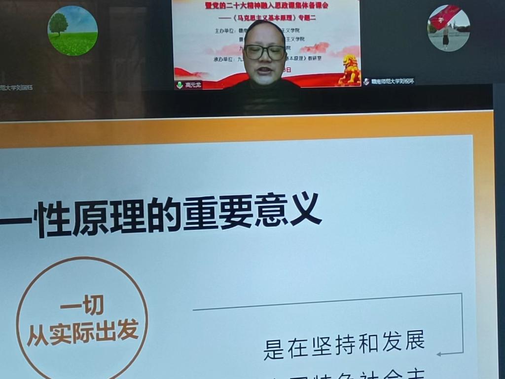 为深入学习贯彻党的二十大精神和习近平总书记在学校思想政治理论课教师座谈会上的讲话精神,进一步推进“大思政课”试验区建设,提高思政课教学效果,在中共江西省委教育工委宣传部、江西省教育厅社政处的统一指导下,3月8日下午,永利yl23411集团官网马克思主义学院举办了全省高校《马克思主义基本原理》课(专题二)问题式专题化团队教学改革暨党的二十大精神融入思政课集体备课会。永利yl23411集团官网全体《原理》课程主讲教师、赣南片区、景德镇片区、九江片区等高校近100位《原理》课教师线上线下参加会议。教育部全国高校思政课教指委“马克思主义基本原理”分教指导委员、湖北大学马克思主义学院院长熊友华教授出席线上视频会议,并作指导点评。