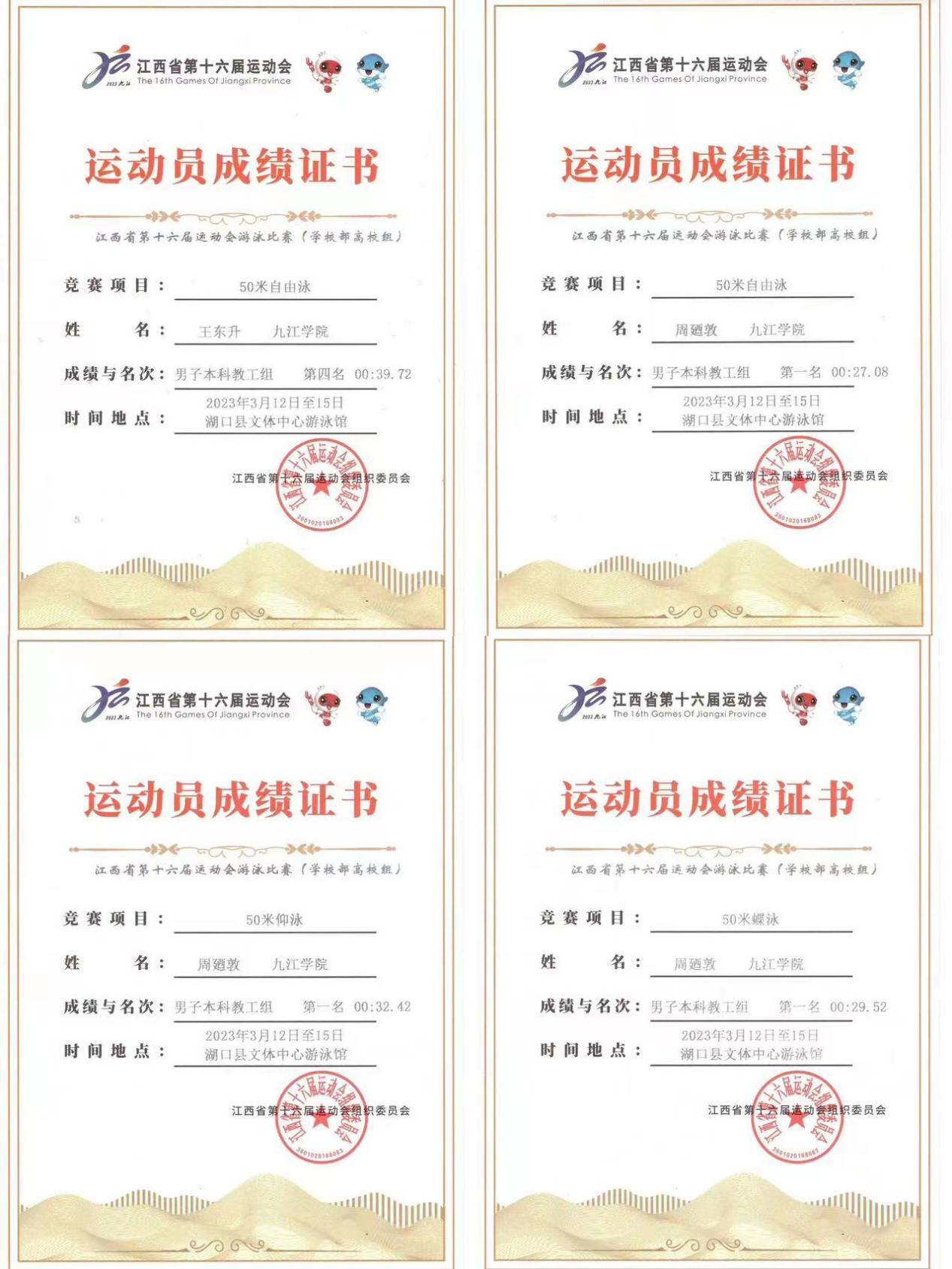 江西省第十六届运动会游泳(高校组)比赛于近日在九江市湖口县顺利举行。教工组参赛队员王东升、周廼敦代表九江学院参加了此次比赛,取得了教工组三个第一、一个第四的优异成绩。