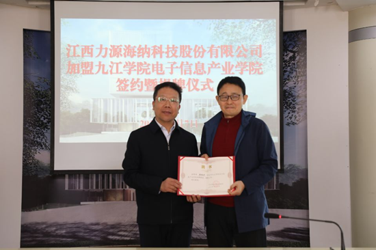 政校企三方领导共同见证了江西力源海纳科技股份有限公司与永利yl23411集团官网电子信息产业学院签订共建协议,并为新的九江市电子信息重点产业链龙头企业加盟揭牌。严平代表学校为江西力源海纳科技股份有限公司董事长黄瑞炉颁发聘书。