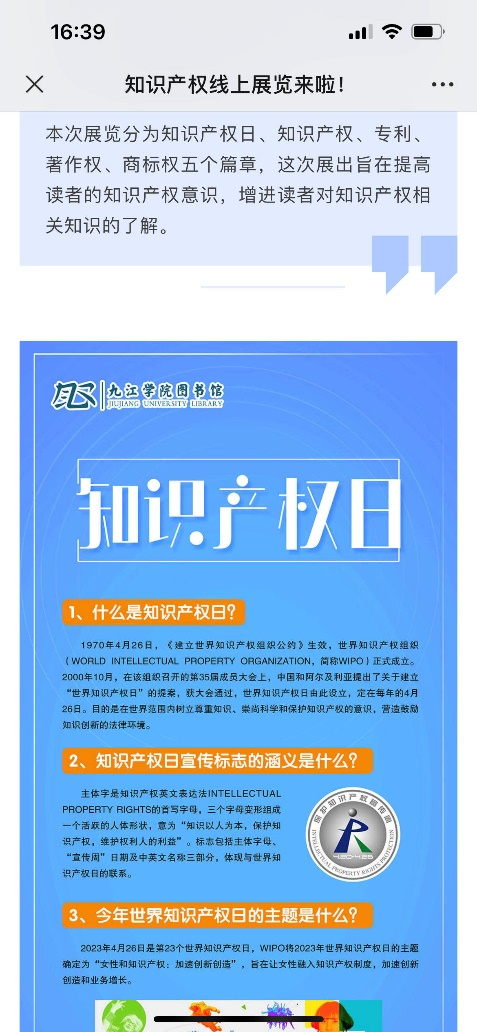 今年4月26日是第23个知识产权日,其主题是“女性和知识产权:加速创新创造”。4月20日至4月26日(全国知识产权宣传周),九江学院图书馆联合九江市市场监督管理局(知识产权局)推出了系列活动,提高师生的知识产权保护意识,促进科研创新。