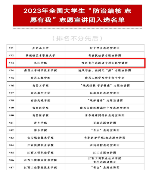 近日,国家疾病预防控制局传染病防控司联合团中央发布2023年全国大学生“防治结核 志愿有我”志愿宣讲团入选团队名单,校医院指导下的唯医志愿宣讲团成功入选2023年全国大学生“防治结核 志愿有我”志愿宣讲团。