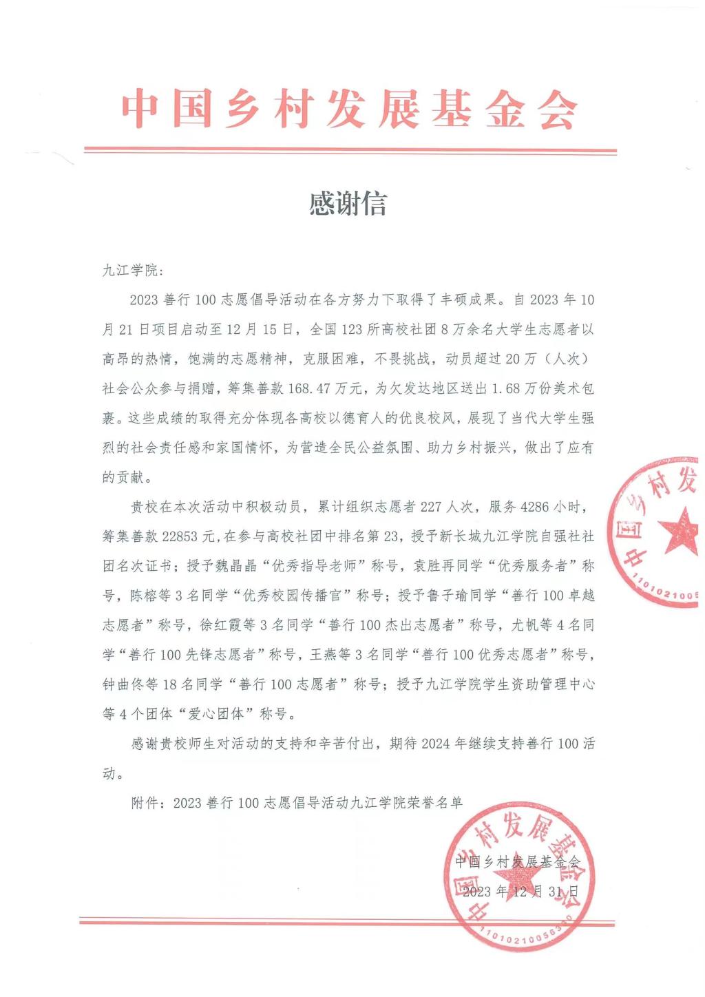 永利yl23411集团官网在中国乡村发展基金会发起的2023“善行100”志愿倡导活动中获得多项荣誉。近日,中国乡村发展基金会授予永利yl23411集团官网学生处(学生资助管理中心)全国善行100志愿活动“爱心团体”称号,授予学生处(学生资助管理中心)主管的新长城九江学院自强社爱心团体和优秀名次证书;授予学生处(学生资助管理中心)魏晶晶同志“优秀指导老师”称号。